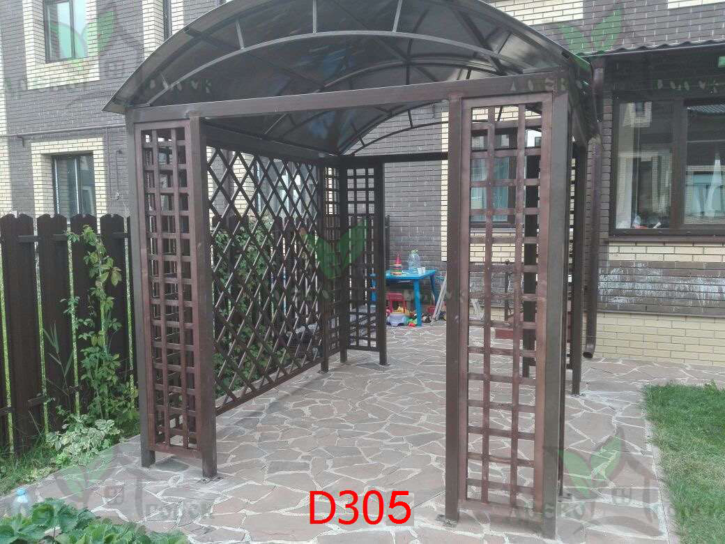 1. Пример на фото. К готовой металлической беседке добавляются деревянные шпалерные решетки, столбы, навес из поликарбоната.